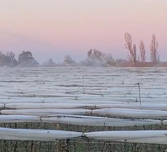 La modification des températures annuelles nécessite la mise en place de techniques adaptées pour limiter l’effet du gel qui détériore ou détruit certaines cultures. La protection antigel consiste à mettre en place des asperseurs généralement au-dessus des arbres délivrant la quantité d’eau nécessaire à la protection de ceux-ci.